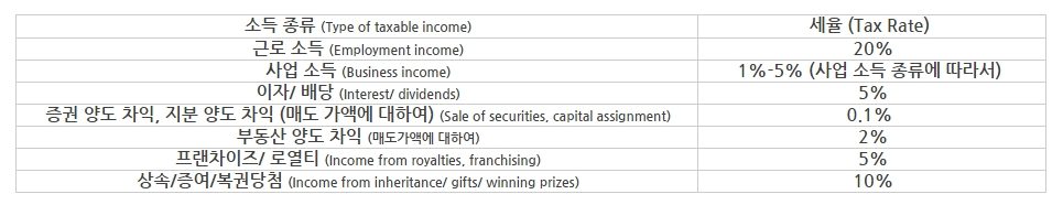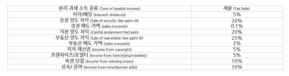 개인소득세율표 – 비 거주자 (Non-residents)
