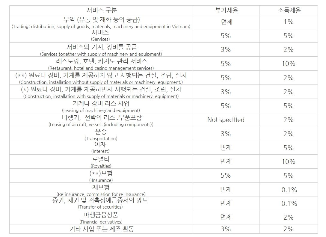 적용됩니다. 이 원천징수 세는 베트남과 외국에서 제공된 서비스에 대하여 베트남에서 창출된 (derived in Vietnam) 소득에 대하여 적용되는 세인데요. 단, 단순재화수입 또는 수리, 교육, 광고 등 일체의 서비스가